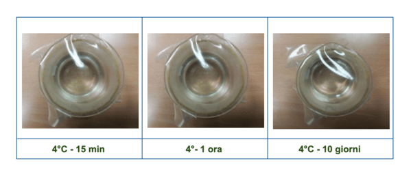 Il Cold-fog test replica le condizioni di raffreddamento della confezione utilizzando un bicchiere pieno d'acqua coperto da un film campione a 4°C per periodi di tempo variabili.